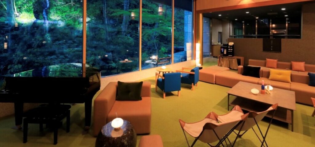 ホテルの従業員はネコロボットです。渓谷を越えてたどり着く滝見の宿となっています。お部屋からも川の音と、塩原の自然が一望出来るんです。